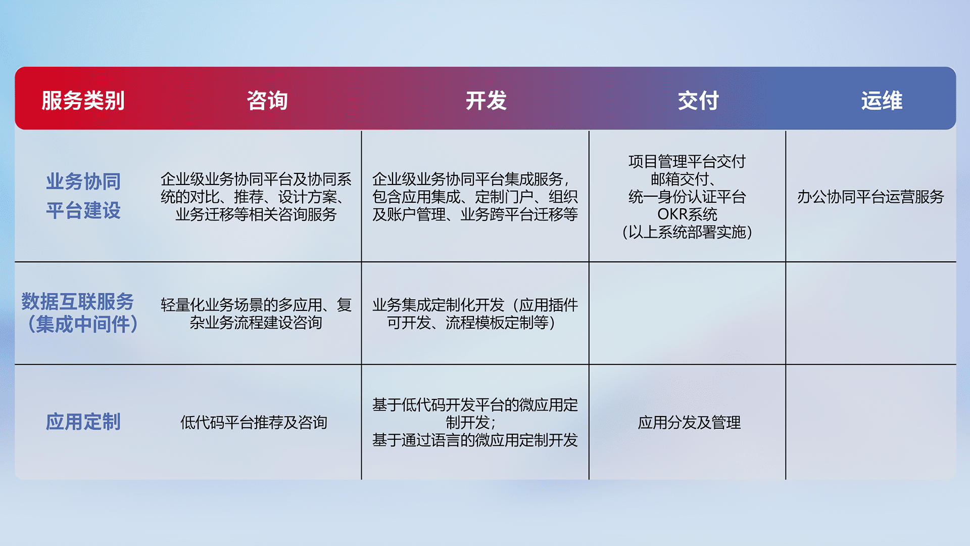 针对钉钉、、、、企微、、IDaas等平台级产品提供产品的规划、、、、方案、、、交付、、、、定制化开发等服务,,,,实现如统一协同办公、、、、智能客户服务、、、混合会议管理、、智能数据查询、、等业务场景,,,实现数字化转型。。。
